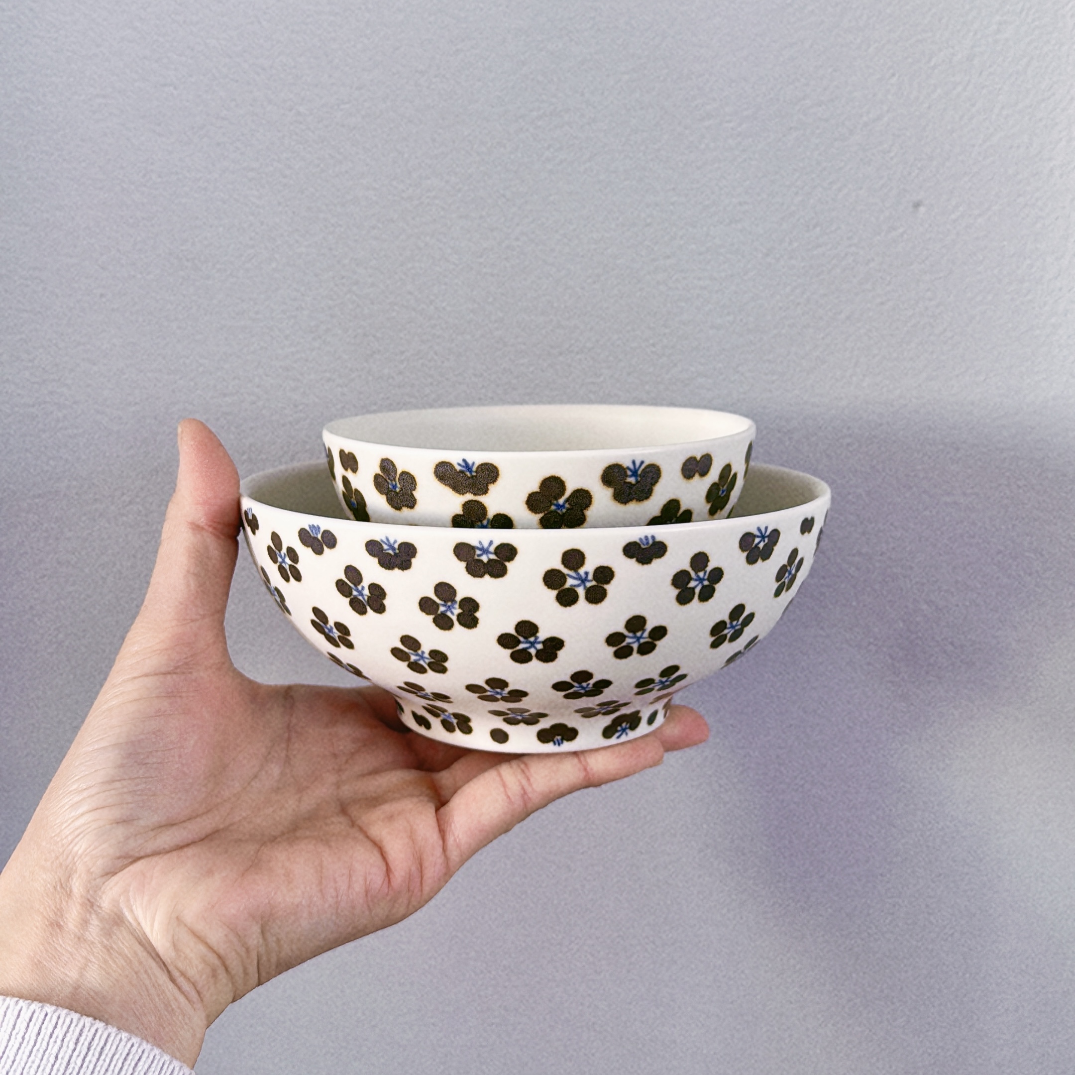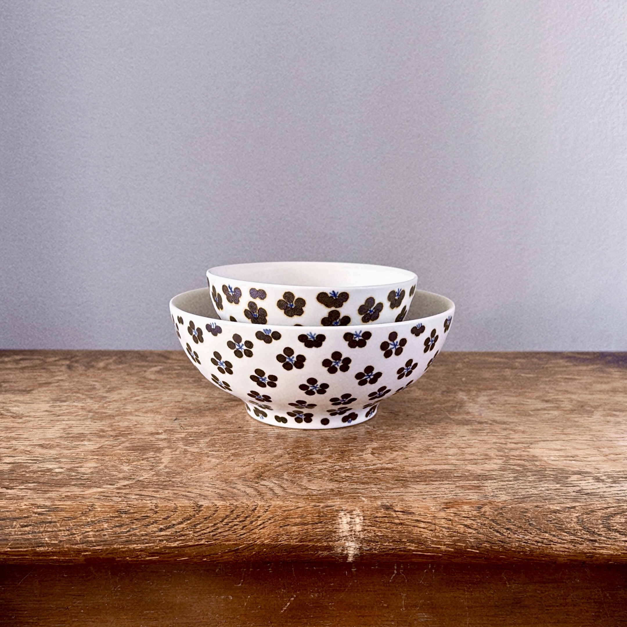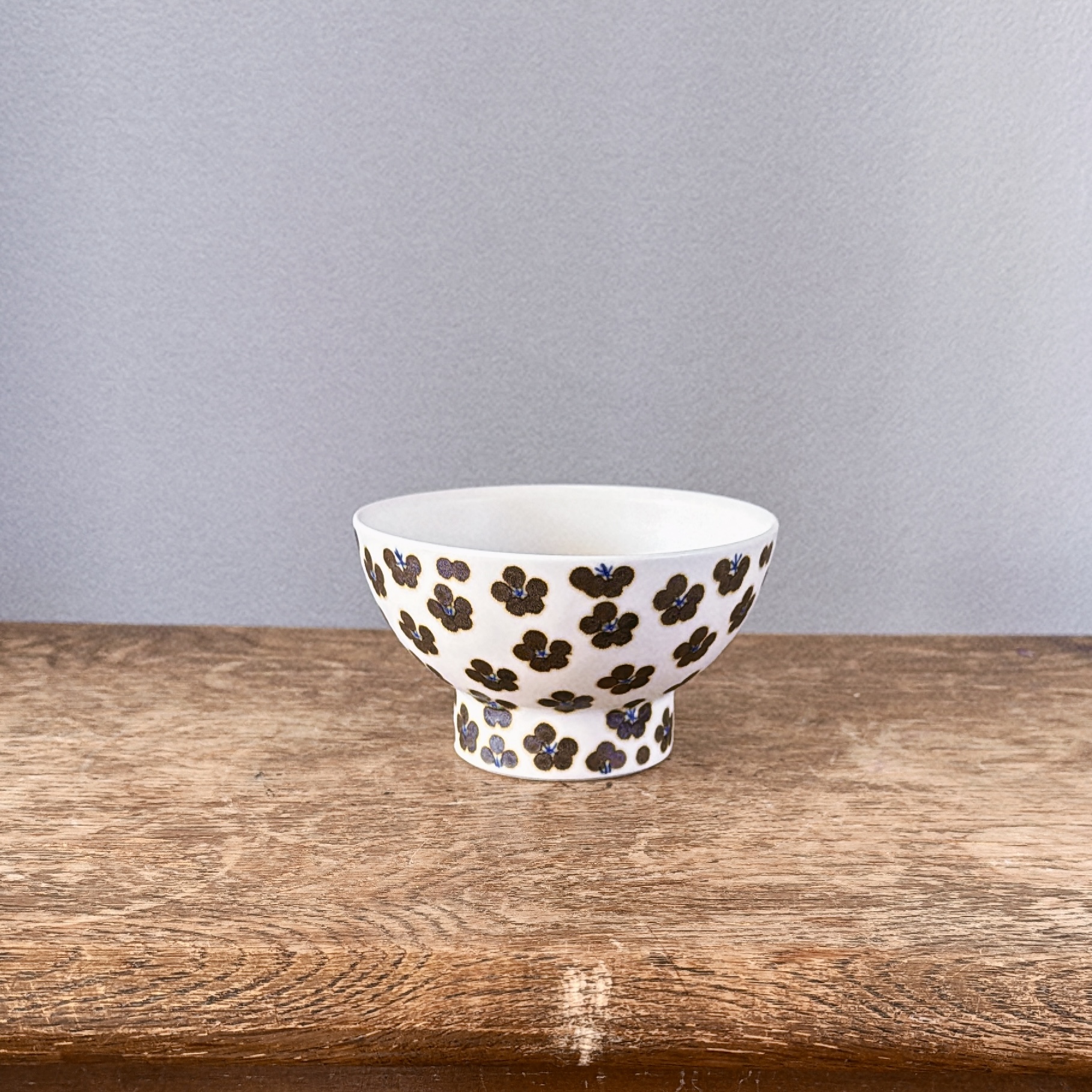 This playful pattern of "komon" is one of the studio's signature styles, which comes from old kimono patterns. This version is with a brown hue giving more soft and warm impressions. The bowl is originally made as a rice bowl, however it can be used for serving olives, dip or any small dish of your choice.